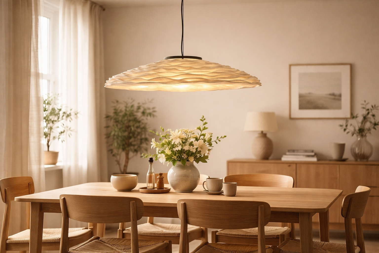 The organic form adds character and depth, making the lamp feel almost sculptural while remaining light and understated. It works beautifully as a focal point above a dining table, in a living space, or anywhere you want to introduce a sense of softness and individuality.