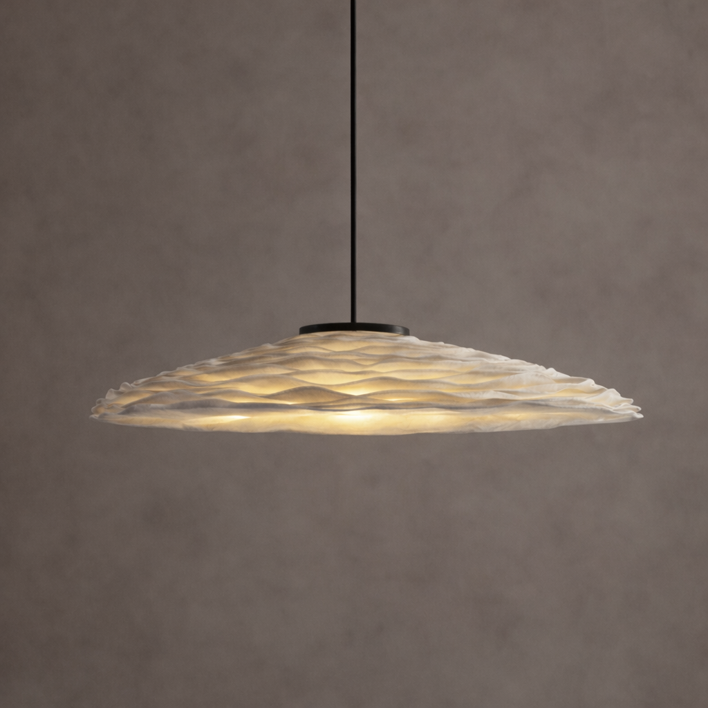 This pendant lamp introduces a quiet sense of movement and calm. Its layered, wave-like surface creates a subtle play of light and shadow, giving the impression of gentle ripples frozen in time. When illuminated, the lamp emits a warm, diffused glow that feels both soothing and expressive, transforming the room without dominating it.